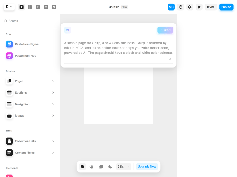 Genau wie ChatGPT & Co. können Sie den KI-Generator von Framer individuell mit Prompts bedienen. Beschreiben Sie, was für eine Seite Sie erstellen möchten, welche Inhalte Sie dafür benötigen und was Sie sich optisch vorstellen, dann macht sich Framer an die Arbeit und erstellt eine Website, die auch gleich mit Texten und Bildern gefüllt wird.
