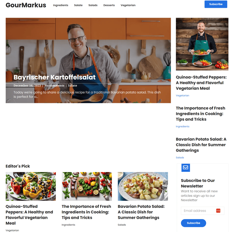 Beispiel-Prompt: „Erstelle einen Blog für einen Foodblogger namens Markus, der darauf seine Lieblingsrezepte teilen möchte. Er sollte kräftige Farben haben und ein buntes Foto von Markus beinhalten. Die Startseite sollte die verschiedenen Rezeptkategorien (z. B. Desserts, Vegetarisch) zeigen und ein „Rezept des Tages“ enthalten.“