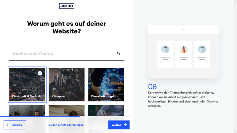 Jimdo stellt Ihnen einige Fragen zu Ihrem Projekt und erstellt dann automatisch die Grundversion Ihrer Website.