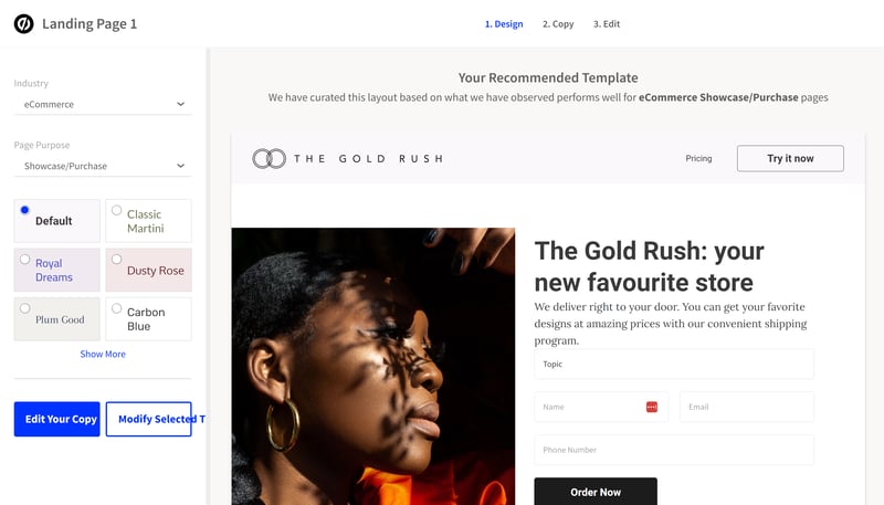 Sobald Sie Ihre Firmendetails bestätigt haben, beginnt GetResponse mit der Landingpage-Generierung. Sie erhalten dann drei Designvorschläge zur Auswahl, von denen Sie eines auswählen und im nächsten Schritt weiter bearbeiten können. Dann landen Sie im GetResponse-Editor, wo Sie Layout, Texte und Bilder anpassen und Ihre Landingpage, wenn Sie fertig sind, veröffentlichen können.