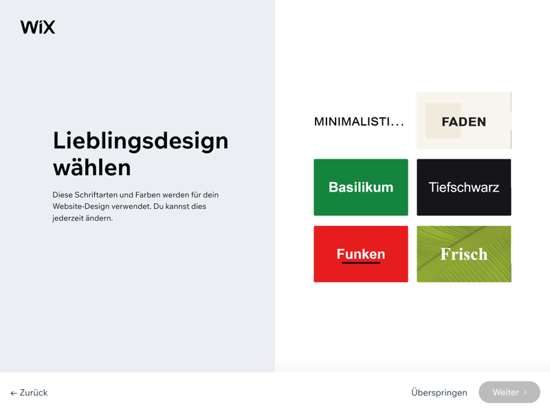 Wenn Sie ein neues Website-Projekt erstellt haben, können Sie deren Design entweder klassisch per Template gestalten oder von Wix automatisch generieren lassen. Dafür müssen Sie nur ein Design auswählen, das Ihnen gefällt, und Wix erstellt darauf basierend automatisch einige Design-Vorschläge für Ihre Homepage. Gängige Unterseiten, wie z. B. eine Kontakt- oder Über uns-Seite, können Sie ebenfalls gleich hinzufügen.
