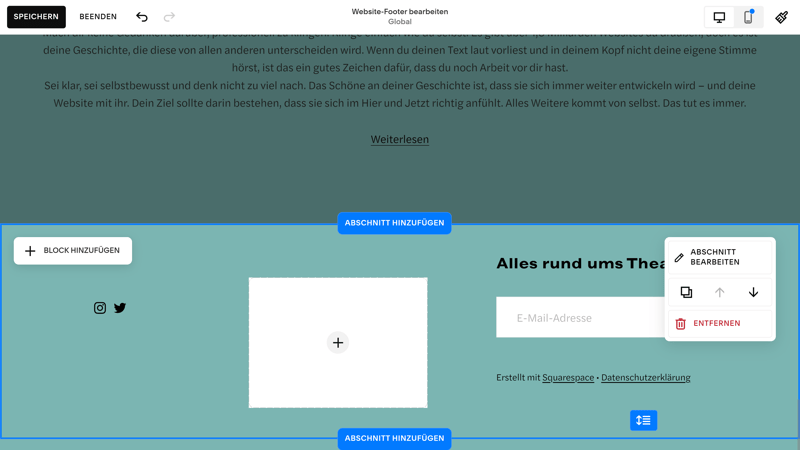 Den Footer können Sie genauso einfach bearbeiten. Im Gegensatz zum Header handelt es sich dabei aber um einen regulären Abschnitt, den Sie also deutlich freier als die Kopfzeile anpassen können. Hier haben Sie ganz klassisch die Möglichkeit, unterschiedliche Blöcke hinzuzufügen und frei zu konfigurieren.