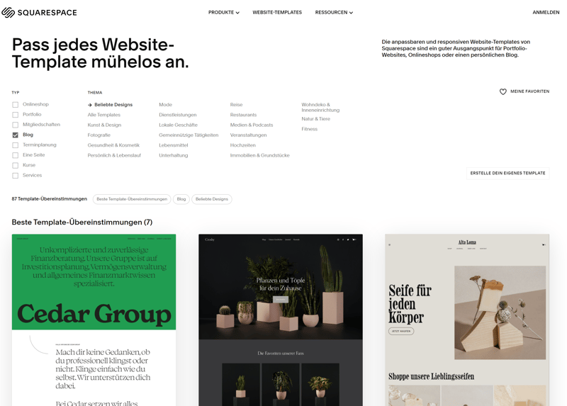 Schneller geht es, wenn Sie vorgefertigte Seiten auswählen, die Sie dann weiter anpassen. Hier bietet Squarespace eine große Auswahl, die alle wichtigen Seitentypen abdeckt.