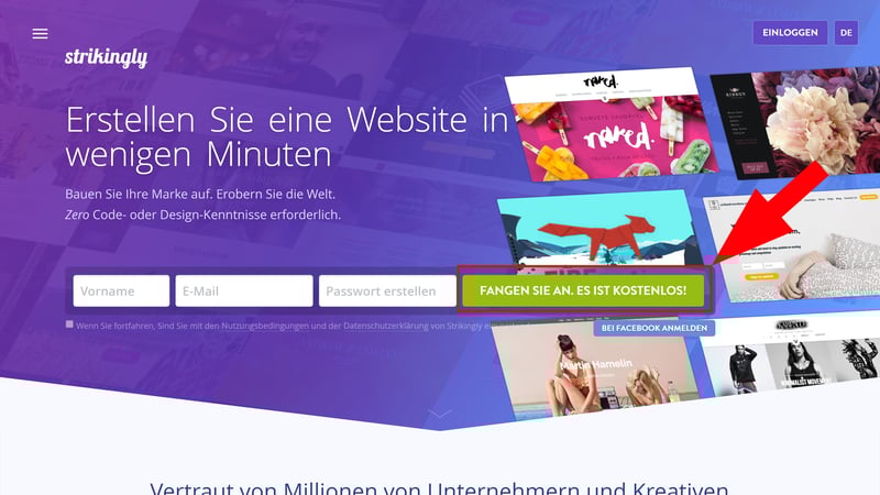 Sie können sich ohne Angabe von Zahlungsdaten bei Strikingly registrieren.