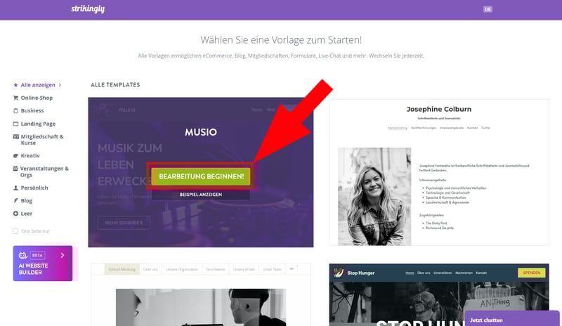 Sie können sich für jede Vorlage eine Beispielseite anzeigen lassen oder sie mit Klick auf den „Bearbeitung Beginnen!“-Button direkt auswählen.