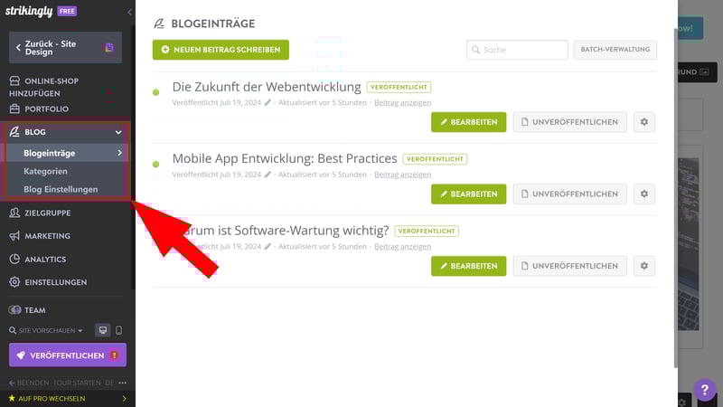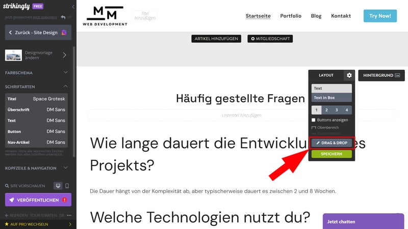Der Editor von Strikingly: Einfach und klar strukturiert
