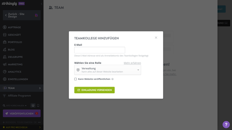 Teamverwaltung: In den Einstellungen finden Sie auch eine Team-Sektion. Hier können Sie Teamkollegen einladen und ihnen bestimmte Rollen zuweisen. „Blogger“ können etwa nur Blogbeiträge schreiben und Blog-Einstellungen bearbeiten, den Rest Ihrer Website jedoch nicht editieren.