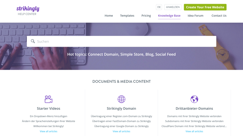 Im Help Center von Strikingly finden Sie Text- und Video-Anleitungen, die in Kategorien wie „Abschnitt bearbeiten“, „Vorlagen & Stile“ und „Analytik & SEO“ unterteilt sind. Mit der Suchfunktion am Seitenanfang können Sie schnell die relevanten Artikel aufspüren.