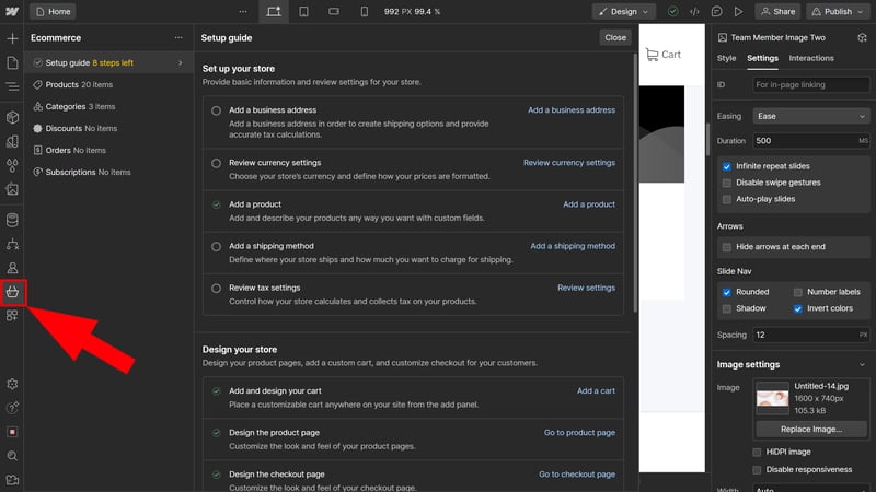 Bei Webflow sind E-Commerce-Funktionen grundsätzlich integriert, allerdings müssen Sie dafür einen der drei E-Commerce-Tarife wählen (mehr zu den Kosten im nächsten Kapitel). Im teuersten Tarif können Sie bis zu 15.000 Produkte anbieten.