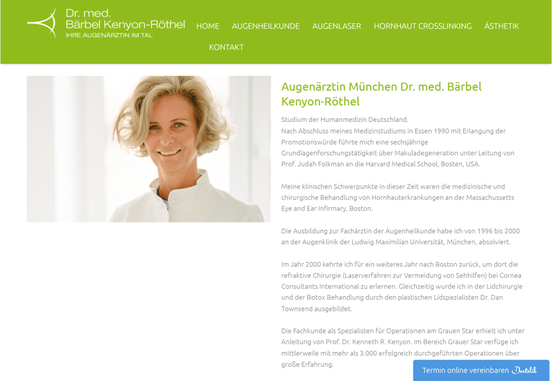 Im Abschnitt „Über uns“ erzählt diese Ärztin über ihre Qualifikationen. (Quelle: Dr. Kenyon)