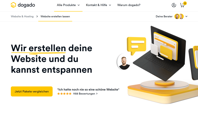Hier sind die Preise vom Anbieter abhängig. Bei dogado bezahlen Sie monatlich etwa zwischen 40 und 80 €, je nachdem, wie viele Unterseiten, E-Mail-Adressen oder Änderungen Sie sich wünschen. Aspekte wie Hosting oder Domains, um die Sie sich andernfalls selbst kümmern müssen, sind in diesem Monatspreis jedoch schon enthalten.