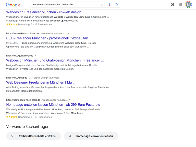 Google kann zahlreiche Freelancer mit eigener Website für Sie ausfindig machen.