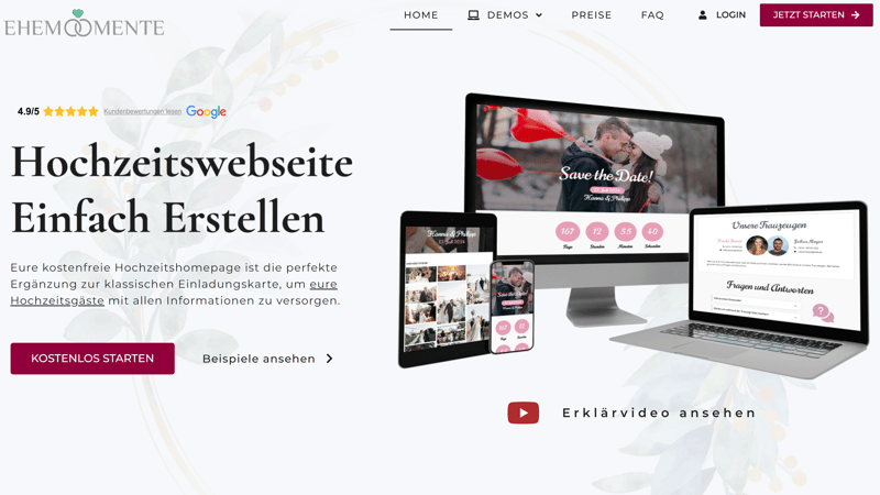 Ein weiterer Anbieter ist Ehemomente. Dort gibt es drei Website-Typen, jeweils mit eigenen Templates und Funktionen: Save-the-Date, Hochzeitswebsite und Fotogalerien. Die Plattform ist grundsätzlich kostenlos nutzbar, doch viele wichtige Funktionen – darunter auch der Gästezugriff – werden nur in den Premium-Tarifen unterstützt.