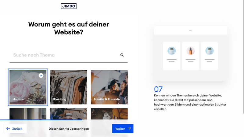 Wenn Sie im Handumdrehen eine simple Hochzeits-Website erstellen möchten, ist Jimdo eine solide Wahl. Ein KI-Assistent sorgt dabei für eine besonders unkomplizierte Einrichtung. Hier können Sie bereits die Hochzeits-Kategorie auswählen und festlegen, welche Seiten und Funktionen – z. B. Bildergalerien, Termine und Buchungen – Sie benötigen.