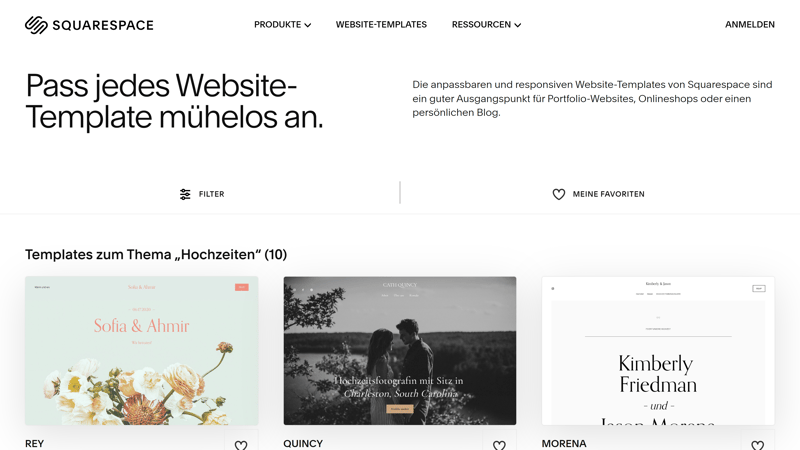 Immerhin zehn Hochzeitsvorlagen finden wir beim Homepage-Baukasten Squarespace, der besonders für seine stilvollen Designs bekannt ist. Durch die zeitlos-eleganten Looks ist der Anbieter natürlich auch für Hochzeitsprojekte einen Blick wert.