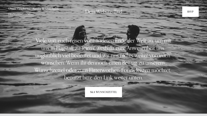 Auf der Startseite (oder dem Startbereich, falls Ihre Hochzeits-Homepage ein One-Pager ist) können Sie Ihrer Seite etwas Persönlichkeit verleihen und Ihren Gästen einen Vorgeschmack auf das bieten, was sie auf Ihrer Hochzeit erwartet.