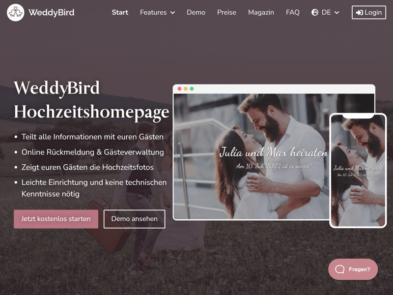 Praktischerweise gibt es auch Baukastensysteme, die speziell für Hochzeitsanlässe entwickelt wurden. Weddybird zum Beispiel: Die Hochzeitsplattform aus Hamburg unterstützt anpassbare Rückmeldungs-Formulare, ein Countdown-Feature und einen exakten Tagesablauf mit Timeline.