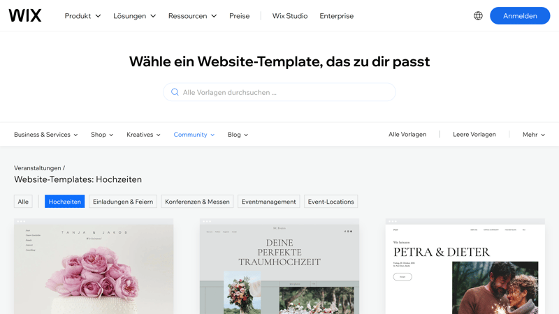 Wenn Sie keine Programmier- oder Design-Erfahrung besitzen und wenig Geld ausgeben möchten, sind Homepage-Baukästen eine gute Wahl. Sie können entweder klassische Homepage-Baukästen wie Wix, Squarespace oder Jimdo nutzen, die allesamt Vorlagen für Hochzeits-Homepages bieten. Alternativ gibt es auch dedizierte Hochzeits-Website-Services wie Weddybird oder Zankyou.