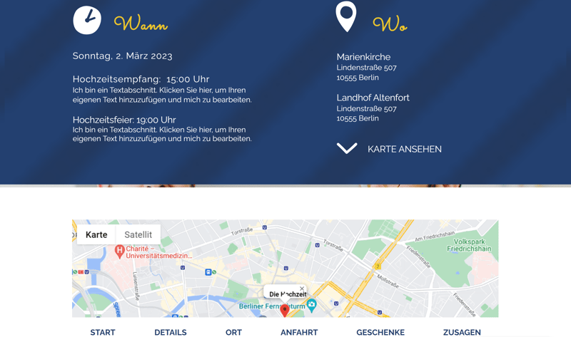 In Vorlagen wie Dario oder Bleecker gibt es beispielsweise vorgefertigte Unterseiten zur Anreise, eine Infoseite zum Thema Geschenke und ein RSVP-Formular, das Sie natürlich ganz einfach personalisieren können. Eine Wunschzettel-Funktion ist auch dabei.