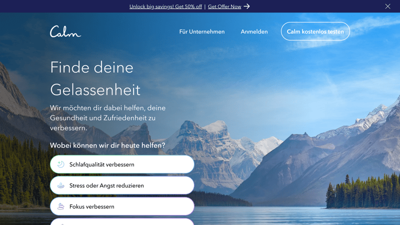 Die Landingpage von Calm, einer Schlaf-App, spricht Besucher mit dem beruhigenden Bild direkt emotional an. Außerdem wird mit der Umfrage sofort klar, welche Probleme Calm lösen will.