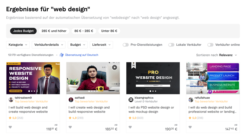 Anders als bei Upwork erstellen Sie nicht vorab Aufträge, auf die sich Fiverr-Freelancer bewerben. Stattdessen geben Sie einfach einen Suchbegriff wie „Webdesign“ oder „Copywriting“ ein und finden eine Auswahl an Freelancer-Profilen, die für Ihr Projekt infrage kommen. Jene bieten ihre Dienste zu verschiedenen Tarifen in Basic-, Standard- oder Premium-Paketen an.