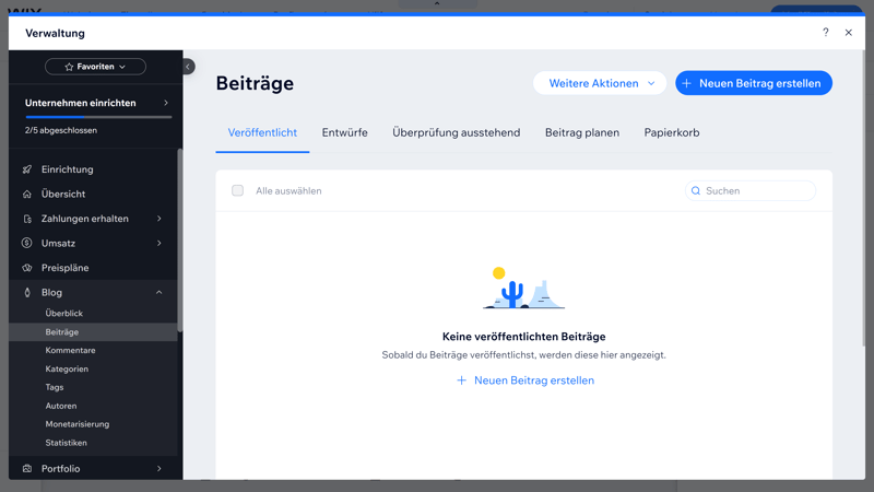 Die Verwaltung Ihrer Blogbeiträge findet nicht direkt im Website-Editor statt, sondern ist ins übergeordnete Wix-Dashboard ausgegliedert. Hier warten alle Funktionen, die Sie für den Betrieb Ihres Blogs benötigen.