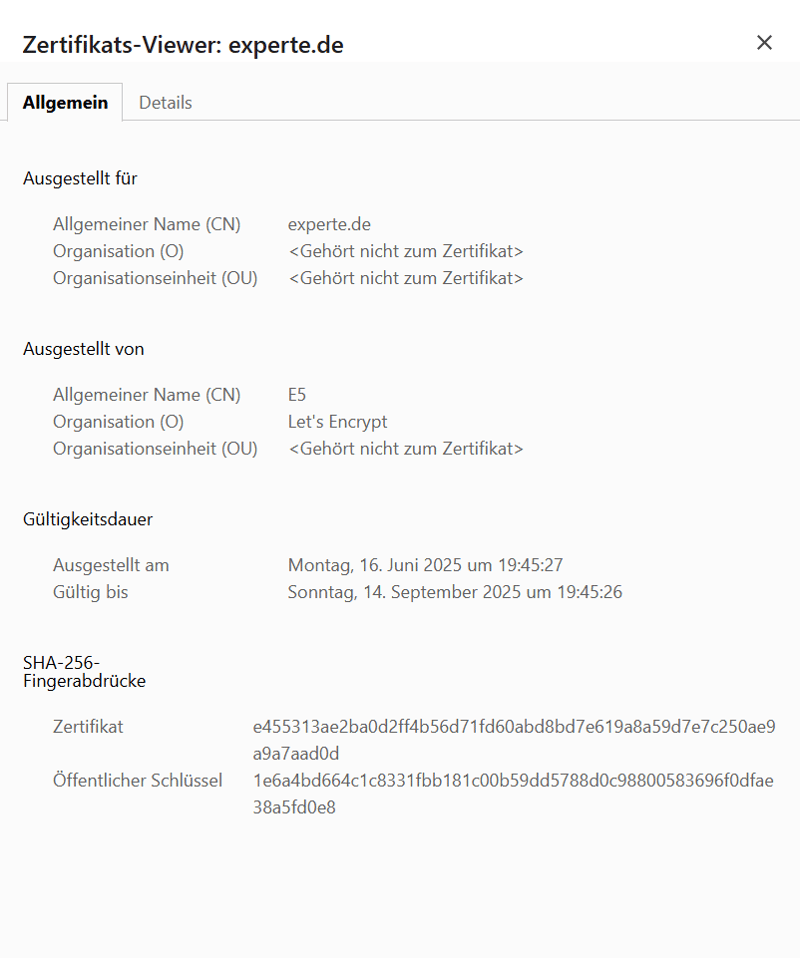 Wenn Sie auf die Schaltfläche klicken, können Sie auch Details zum Zertifikat einsehen – etwa zum Gültigkeitszeitraum, der ausstellenden Zertifizierungsstelle oder dem Domainnamen.