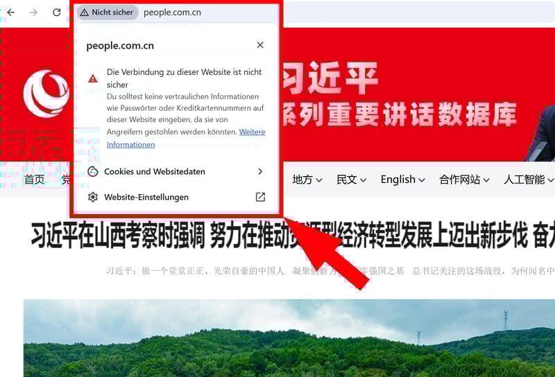 Noch einfacher lässt sich erkennen, wenn eine Website kein SSL/TLS-Zertifikat hat. Dann sehen Sie im Browser-Fenster eine unmissverständliche Warnung, dass die Verbindung nicht sicher ist – wie etwa hier bei Chrome: