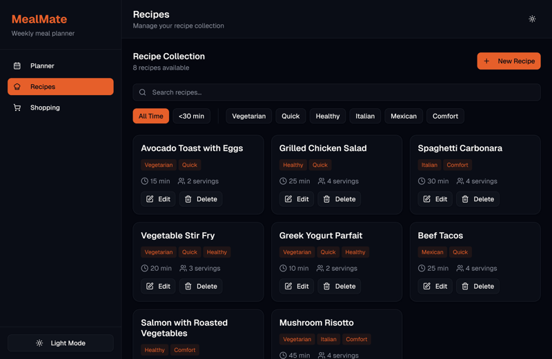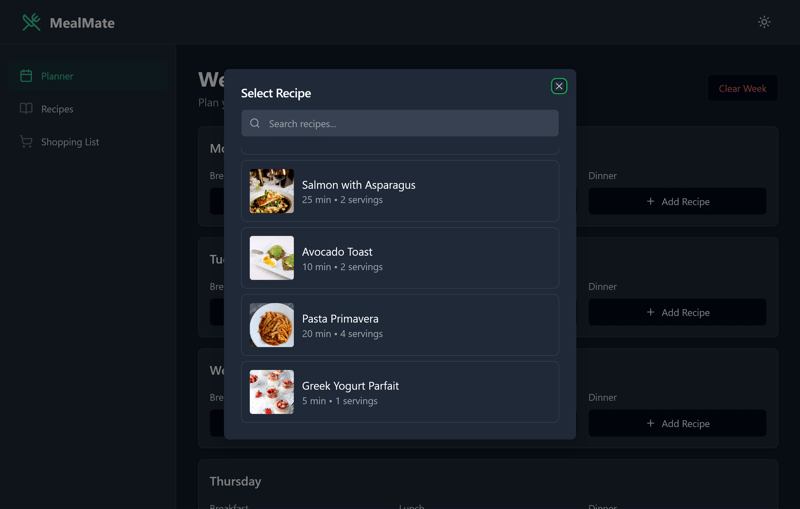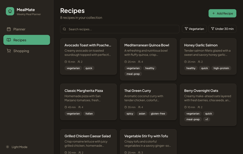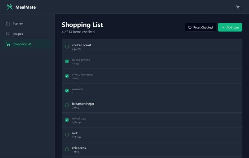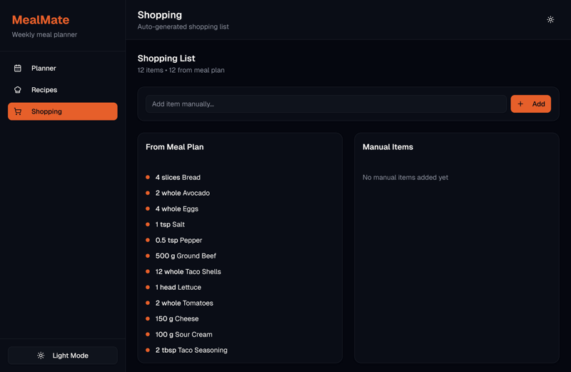 Erstelle einen funktionierenden Web-App-Prototypen für: MealMate, Wochen-Essensplaner & Einkaufsliste.