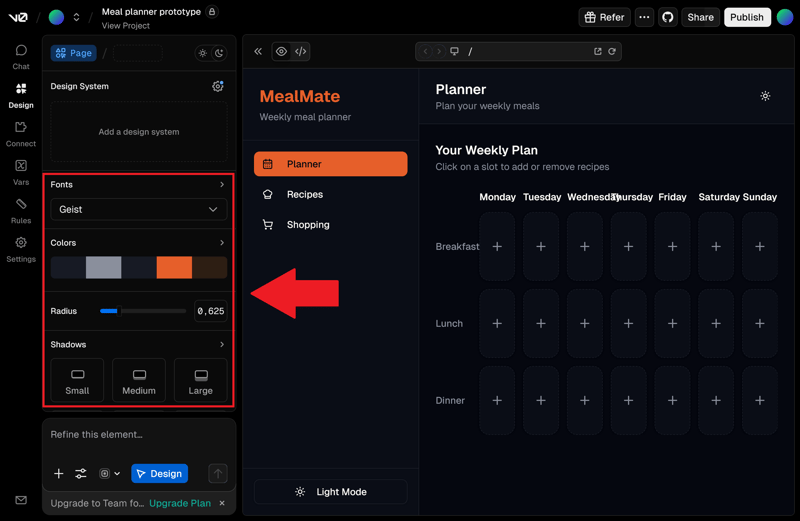 Der Fokus des KI-Builders auf UI macht sich im separaten Design-Modus bemerkbar. Farben, Schriftarten und mehr legen Sie ohne Credit-Verbrauch fest. Neben allgemeinen Vorgaben zum Aussehen designen Sie hier auch einzelne Elemente nach eigener Vorstellung.