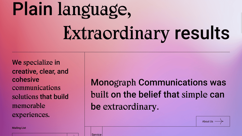 Das Kommunikationsunternehmen Monograph kombiniert mehrere Webseiten-Trends 2022: Farbverläufe, Rahmen, Minimalismus sowie Mikrointeraktionen.