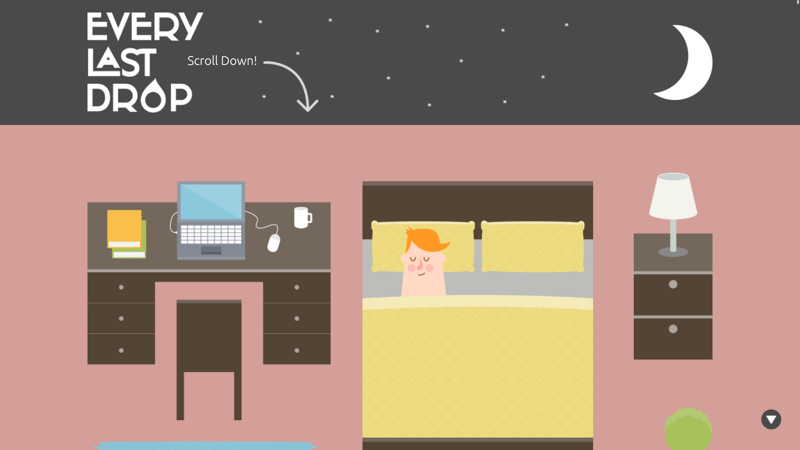 Bei Every Last Drop prangt direkt oben der Aufruf, zu scrollen. Bewegt der User die Maus, verabschiedet sich die Nacht, die Sonne geht auf und eine lehrreiche Geschichte zum Thema Wasserverbrauch beginnt.