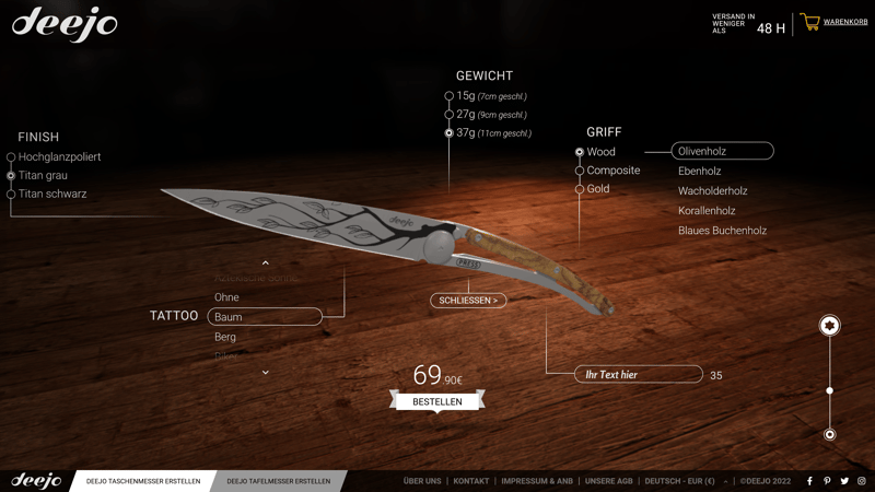 Messer der Firma Deejo kann man virtuell drehen und wenden, wie man möchte und sie direkt am Bildschirm nach den eigenen Wünschen konfigurieren.