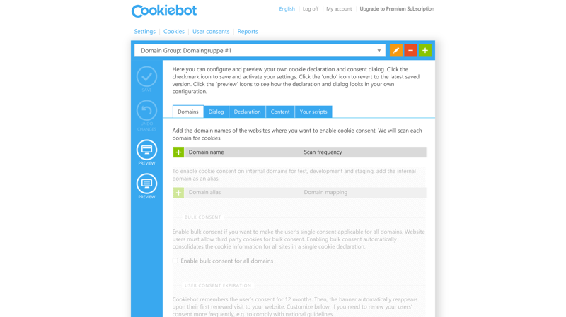 Als europäisches Unternehmen richtet sich Cookiebot vor allem an Nutzer, die mit ihrer Domain der DSGVO entsprechen wollen. Darüber hinaus bietet auch dieses Tool mit dem Cookie Verzeichnis eine Datenbank, in der sich Cookies verwalten lassen. Auch eine auf Geodaten basierende automatische Anpassung der Sprache ist möglich.