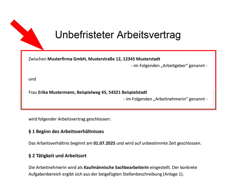 Am Anfang jedes Arbeitsvertrags müssen die vollständigen Namen und Adressen von Arbeitgeber und Arbeitnehmer stehen. Hier legen Sie außerdem fest, wie beide Parteien im weiteren Verlauf bezeichnet werden – in der Regel also als „Arbeitgeber“ und „Arbeitnehmer“.