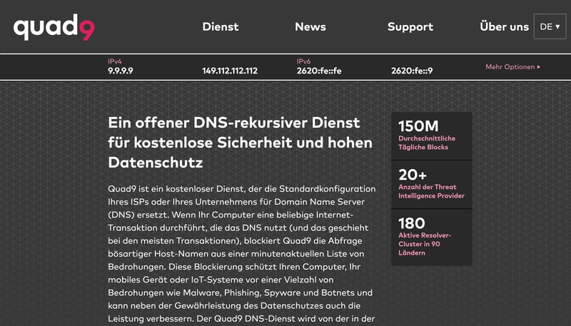 Der in der Schweiz beheimatete und als Stiftung organisierte DNS-Dienst Quad9 stellt kostenfrei unterschiedliche DNS-Server bereit, die jeweils verschiedene Leistungen bieten. Die Server sind auf rund 150 Standorte global verteilt.