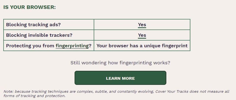 Ergreifen Sie die Maßnahmen, die Ihnen am vernünftigsten erscheinen – und sehen Sie im Vorher-Nachher-Vergleich auf Cover Your Tracks oder Am I Unique, wie sehr sich Ihr Browser-Fingerprint verkleinert hat.