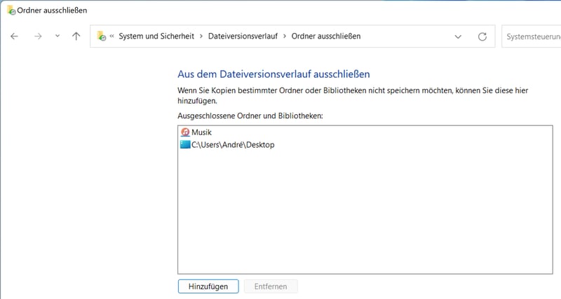 Die Ordner Musik und der Windows Desktop sind in diesem Beispiel vom Dateiversionsverlauf ausgeschlossen.
