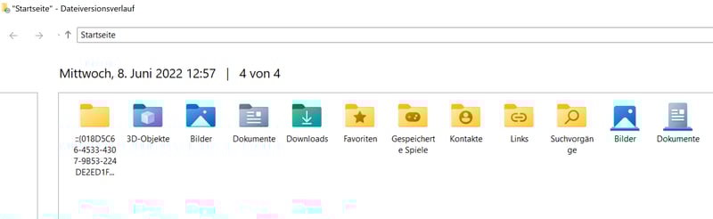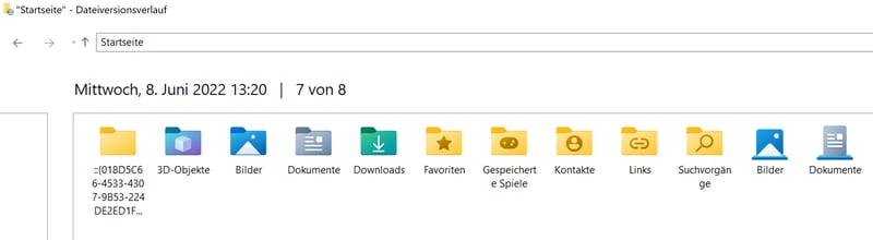 Im folgenden Beispiel wurde versehentlich eine Stock-Grafik gelöscht. Um sie wiederherzustellen, klicken Sie auf Persönliche Dateien wiederherstellen. Es öffnet sich die Startseite des Dateiversionsverlaufs, die eine Übersicht über alle gesicherten Ordner und Dateien liefert.