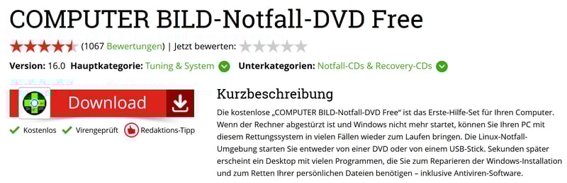 Als Alternative zum PC-WELT-Notfallsystem bietet sich die COMPUTER BILD-Notfall-DVD Free an. Es gibt auch eine kostenpflichtige Version der Software. In dieser hilft Ihnen ein Assistent dabei, Ihre Computer-Probleme zu beheben. In der kostenfreien Version hingegen müssen Sie sich mit Anleitungen in Form von PDF-Dateien zufriedengeben.