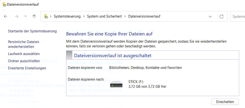 Der Dateiversionsverlauf ist nun eingeschaltet.