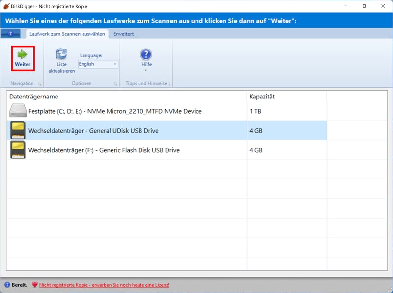 Wenn Sie den Datenträger ausgewählt haben, klicken Sie oben auf den Weiter-Button mit dem grünen Pfeil.