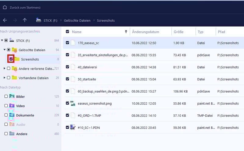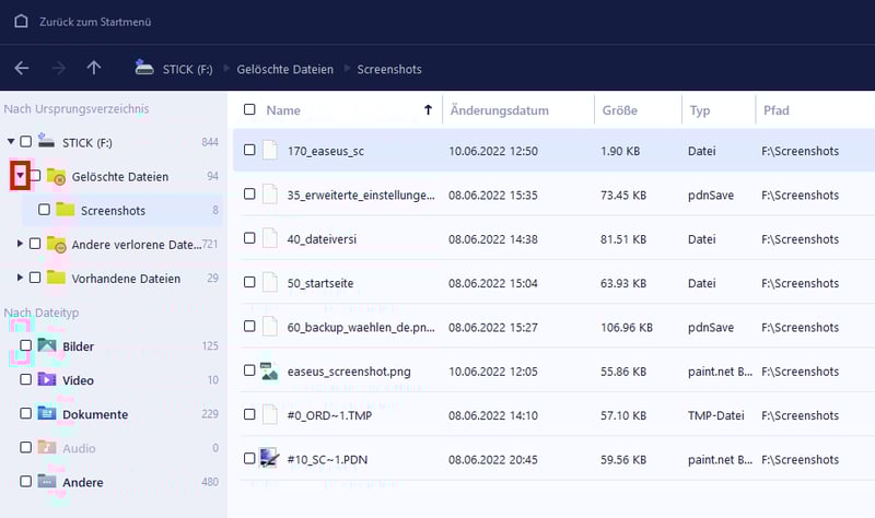 Wenn Sie nach dem Ursprungsverzeichnis suchen, können Sie die drei Verzeichnisse im Menü über das Dreieck-Symbol aufklappen. Ihnen werden dann die enthaltenen Ordner angezeigt. Im Beispiel unten sehen Sie nun das Verzeichnis Screenshots, das ein paar gelöschte Dateien enthält: