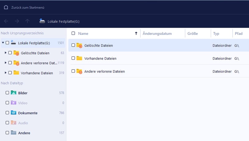 Jetzt können Sie die Dateien wiederherstellen, die Ihnen abhandengekommen sind. Sie können sich dabei die gefundenen Dateien und Ordner entweder nach ihrem ursprünglichen Verzeichnis anzeigen lassen oder nach dem jeweiligen Dateityp, beispielsweise Bilder oder Dokumente.