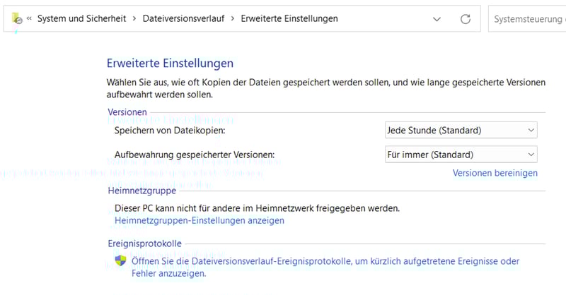 Unter Erweiterte Einstellungen können Sie festlegen, wie oft Windows Backups anfertigen soll. Die Standard-Einstellung ist Jede Stunde. Sie können ebenfalls noch bestimmen, wie lange Ihre Backups aufbewahrt werden sollen. Standardmäßig werden sie Für immer aufbewahrt.