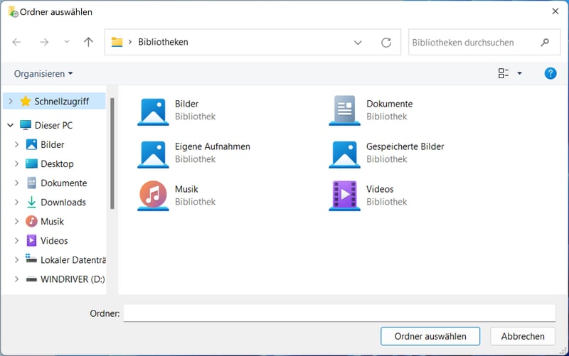 Es öffnet sich nun ein Pop-up, in dem Sie die Ordner auswählen, die nicht für den Dateiversionsverlauf berücksichtigt werden sollen. Das können beispielsweise Ihr Desktop oder einzelne Bibliotheken wie Videos sein. Treffen Sie Ihre Wahl und klicken Sie auf Ordner auswählen.