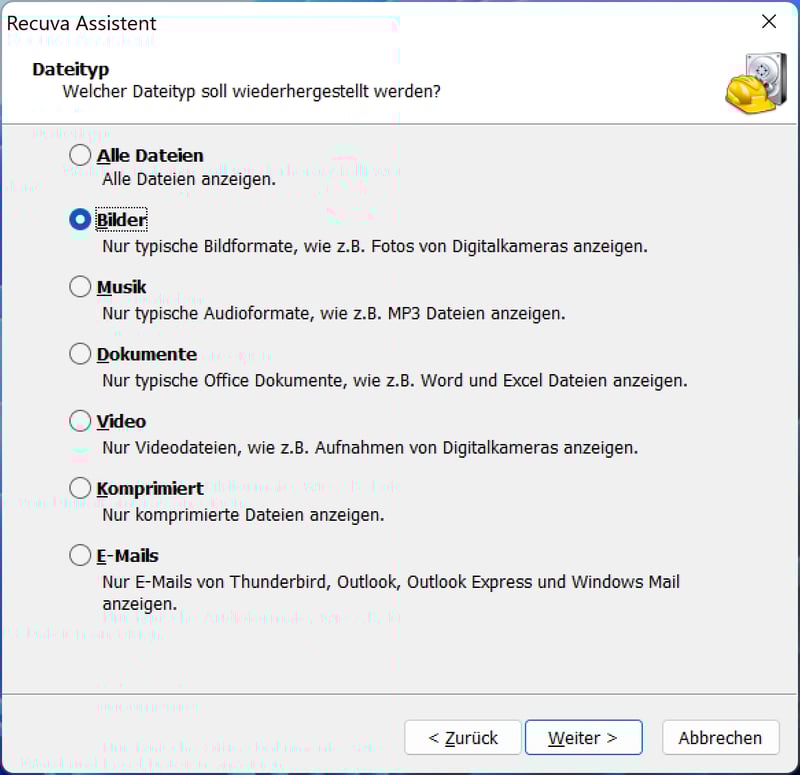Nutzen Sie den Recuva Assistenten, um verlorene Dateien schnell wiederherzustellen.