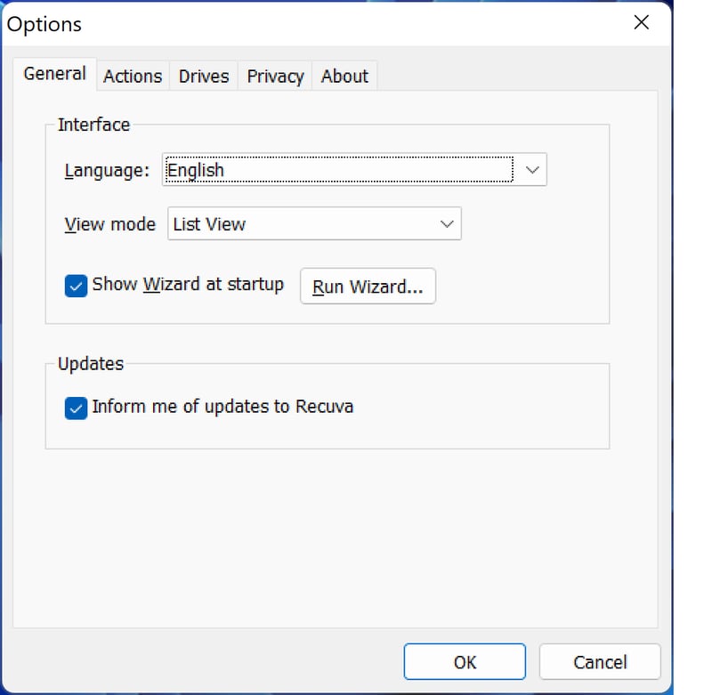 Ändern Sie bei Bedarf die Menüsprache von Recuva über die Drop-Down-Liste.