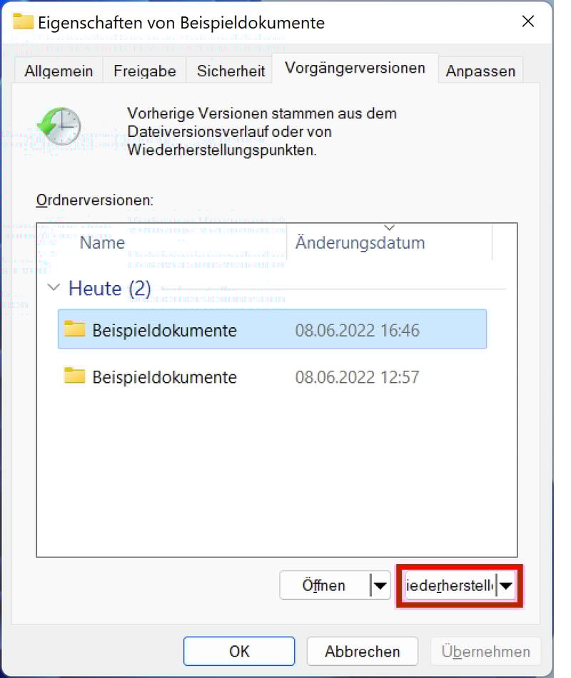 Sie können Vorgängerversionen ganzer Ordner oder einzelner Dateien wiederherstellen.