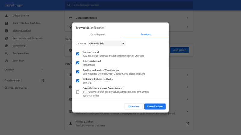 In den meisten Fällen finden Sie eine Option zum Entfernen von Cache, Cookies und Verlauf in den Browsereinstellungen. Bei Google Chrome nennt sich diese Option Browserdaten löschen. Hier sehen Sie unter Erweitert außerdem noch, wie viel Datenmüll sich angesammelt hat und können auswählen, welche und in welchem Zeitraum Sie Daten löschen wollen.